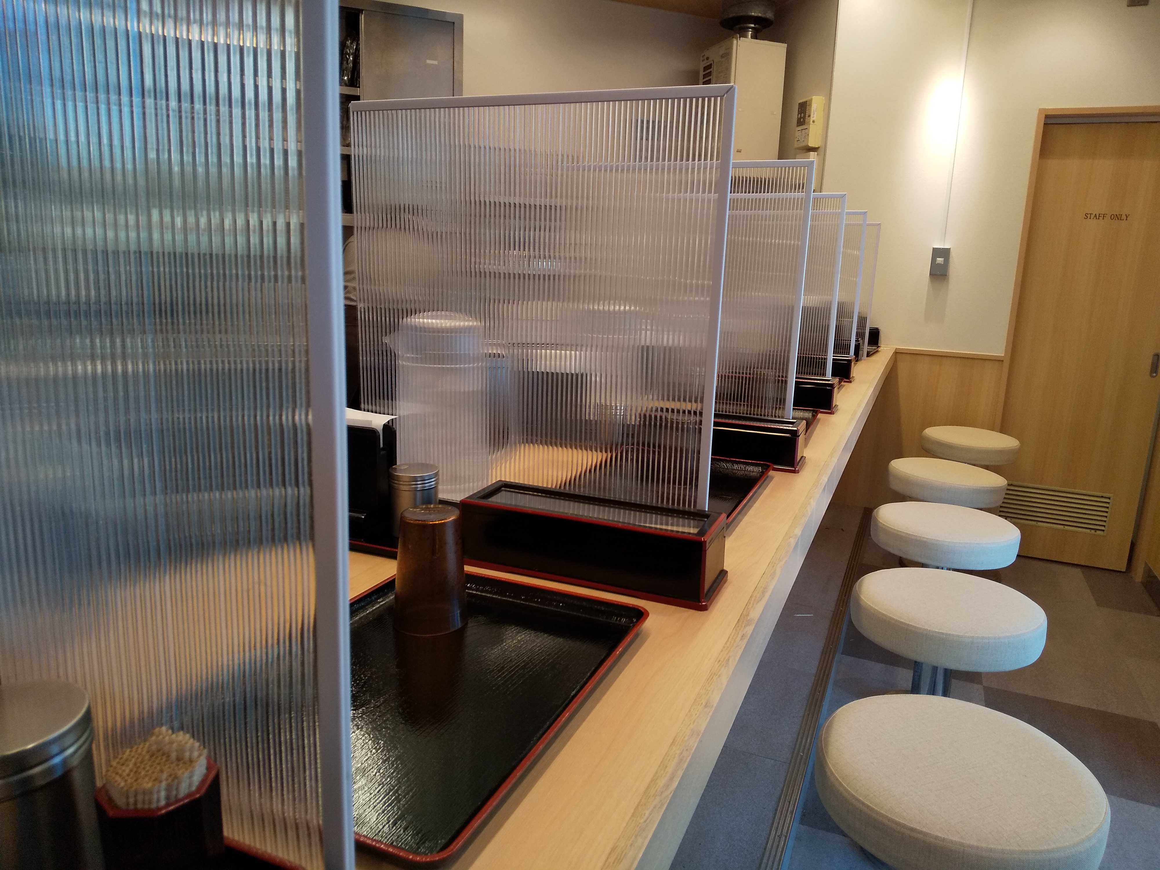 厨房向き直線カウンター8席。入店時はだったが、出る時は