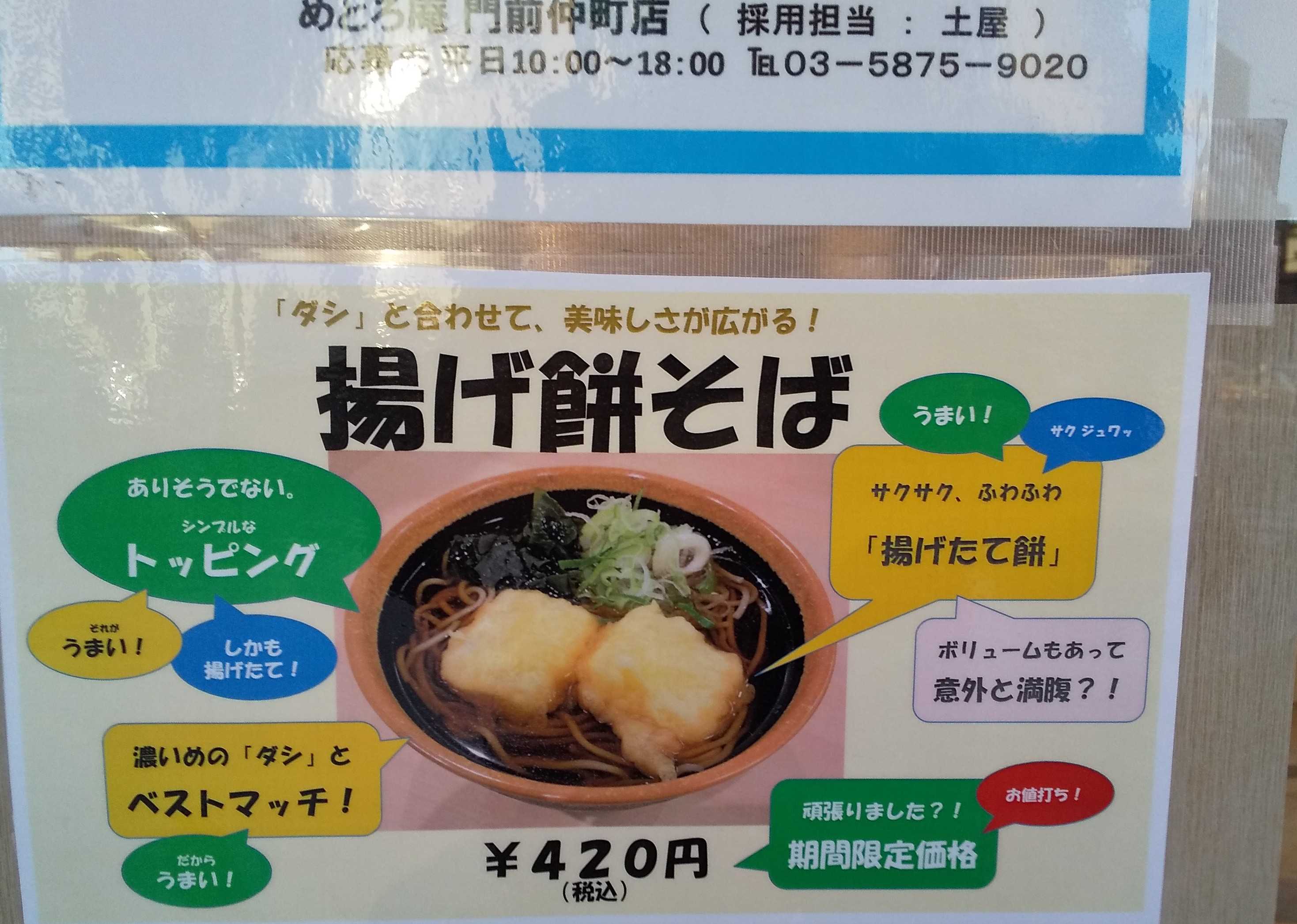 いただいたのは『揚げ餅そば』\420。無料クーポンで大盛り