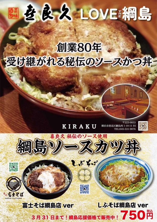 この綱島ソースかつ丼は、綱島西口で「創業八十年」の看板を掲げて今も営業する老舗居酒屋「喜良久(きらく)」が提供しているソースかつ丼のタレを使い、両店が若干のアレンジを加えて提供するものです。