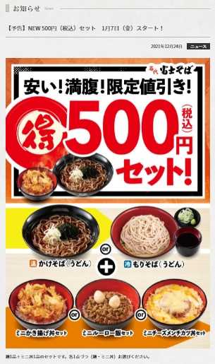 1月7日から始まった「 500円(税込)セット」。『ミニかき揚げ丼セット』『ミニルーロー飯セット』『ミニチーズメンチカツ丼セット』の3つ。2月1日からは新メニュー投入で消える
