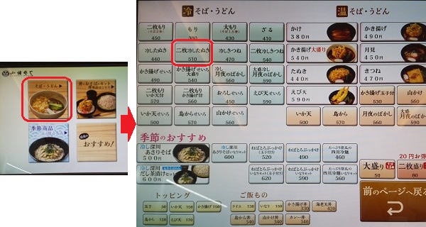 券売機も「そば・うどん」パネルからの展開。量は多めがいいから『二枚冷したぬきそば』だね。