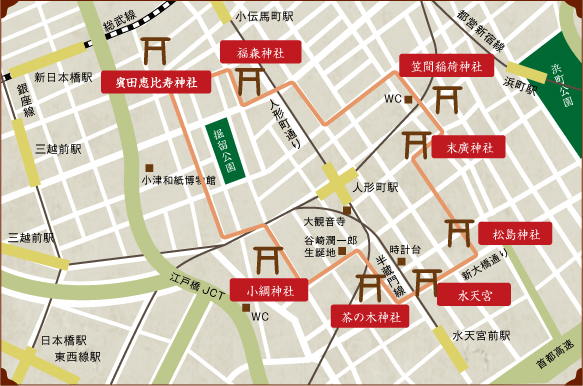 人形町商店街では 日本橋七福神 おすすめ散歩コースMAP(七福神コース) 」を作っている。