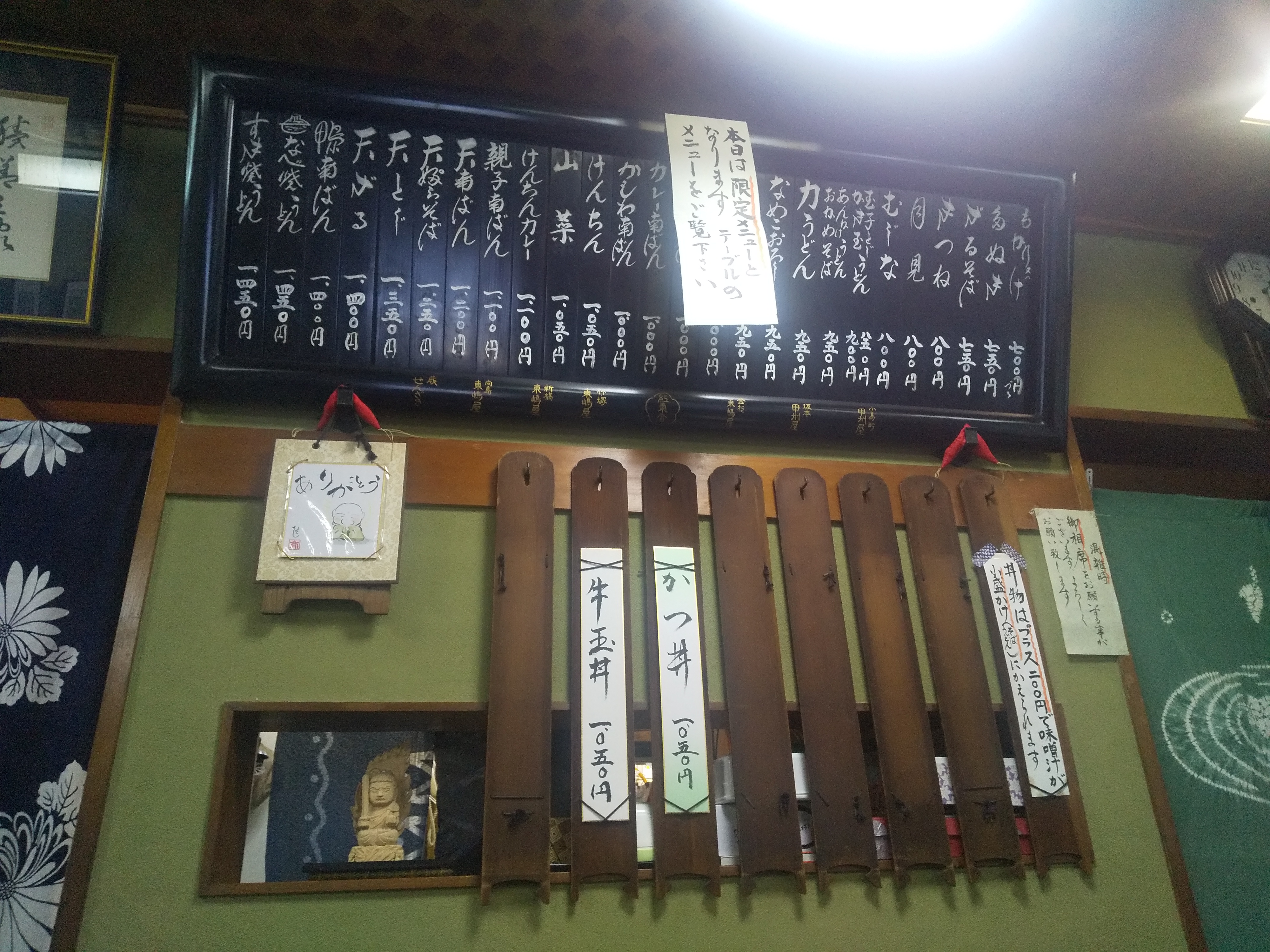 店の前に行列ができていたので、しばし待っての入店。頭上のお品書き。