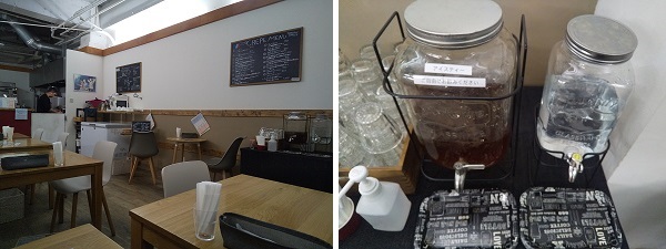 開店してまもなくの入店。後客はテイクアウト2名。4人卓x1、2人卓x5、1人卓x2。水/アイスティー セルフ。男女ふたりで切り盛り。