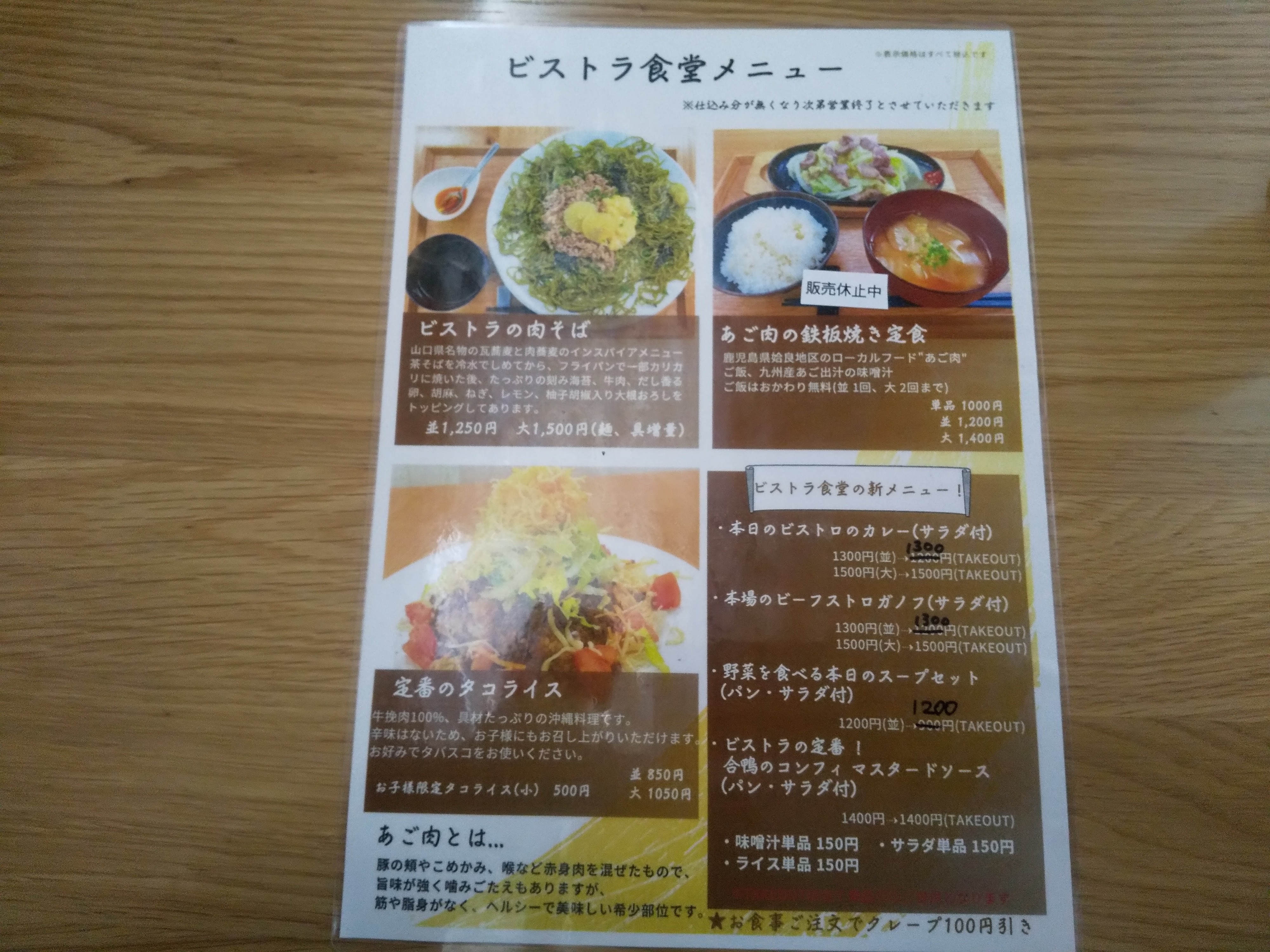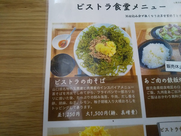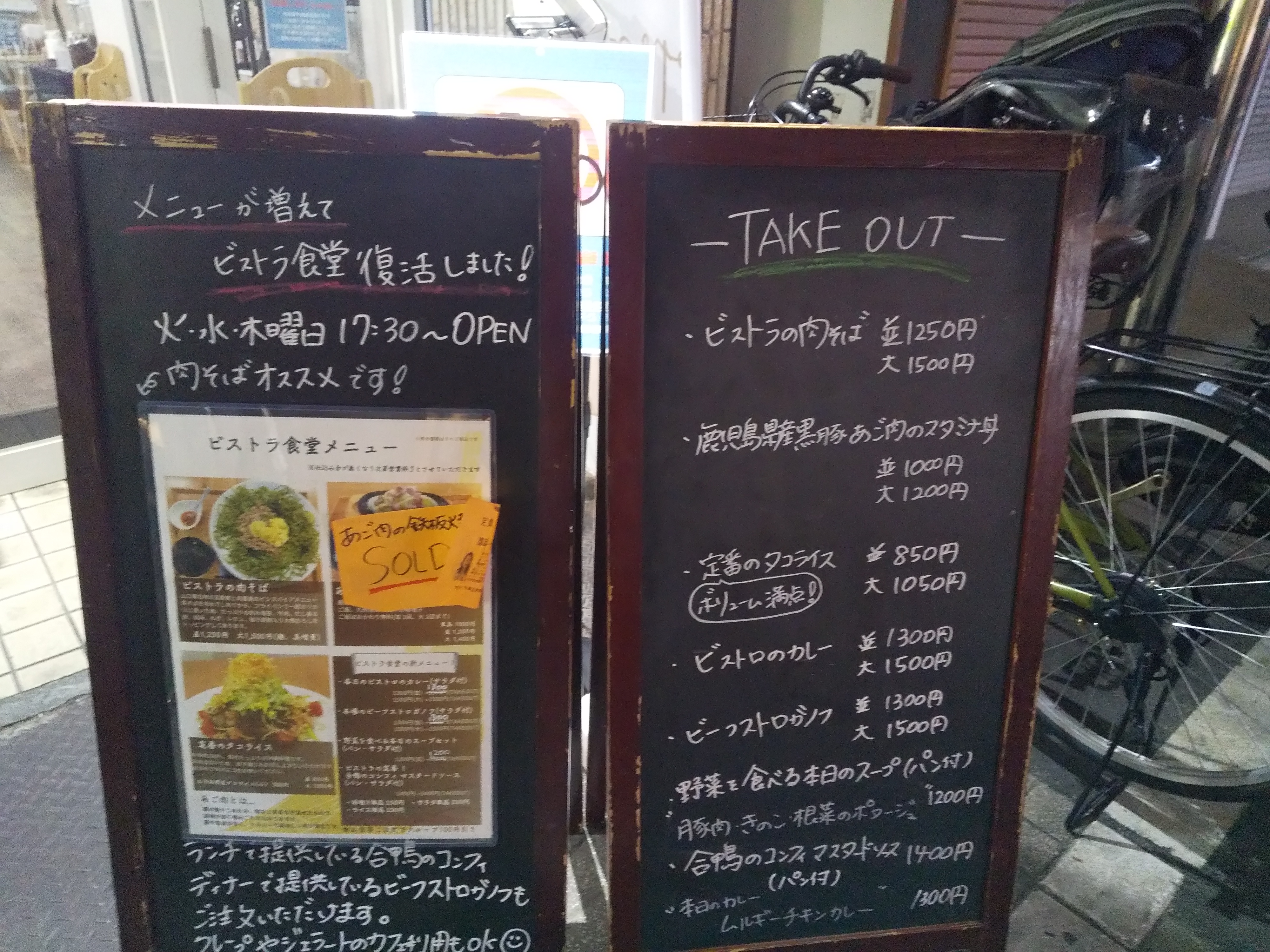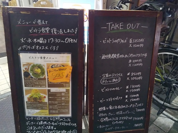 店頭メニュー   火曜日だけの【ビストラ食堂】としての営業が昨年7月に一旦終了し、10月になって営業日もメニューも増やして復活したらしい。