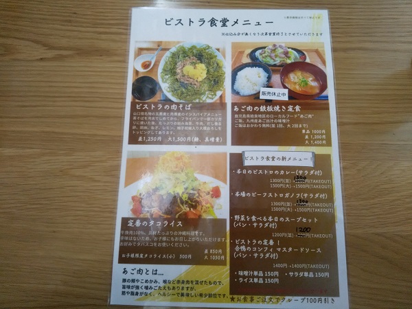 を読んで知ったのだが、火・水・木曜日は17時半から【ビストラ食堂】として、『あご肉の鉄板焼定食』や『肉そば』、『タコライス』等を提供している。