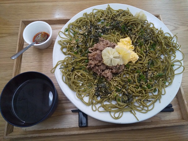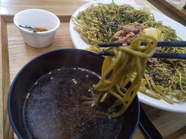 ちょっと焦げ気味の茶そばの部分がパリパリして美味しい。つけ汁にレモンを入れ、茶そば&牛肉をつけていただくが相性もいい。刻み海苔・炒り卵・胡麻・ネギも一緒に。