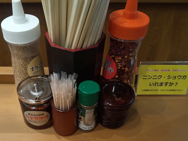調味料いろいろ。店長の自家製ラー油なんてのもある。
