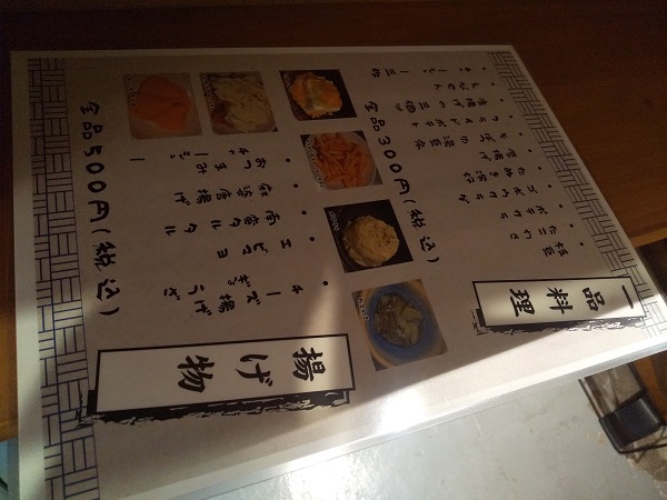 カウンターの荷物を置く棚に おつまみメニューあり。
