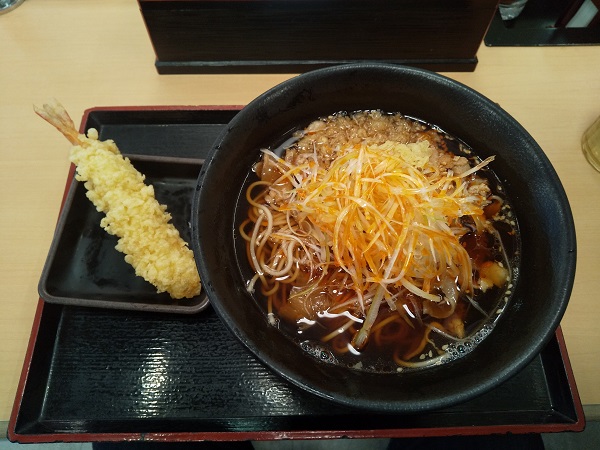 いただいたのは『辛ねぎ肉そば+海老天(クーポン)』\700。