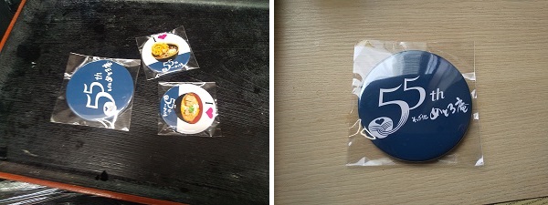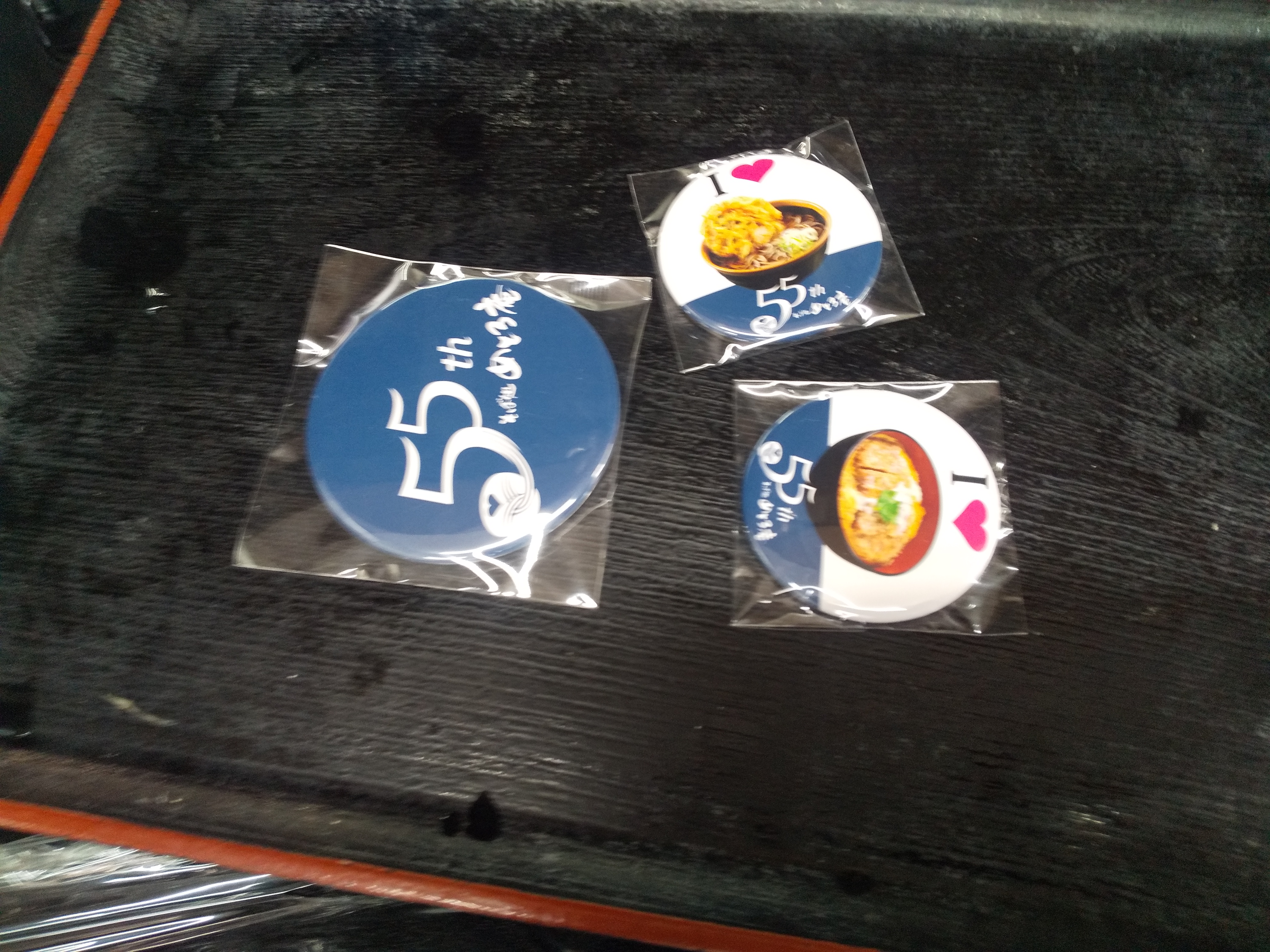 当店に来た目的のひとつは、LINEの友だち登録してもらえる55周年記念キャンペーンの無料トッピングと記念の缶バッチだ  特典2と3ね