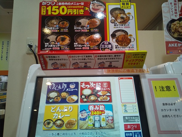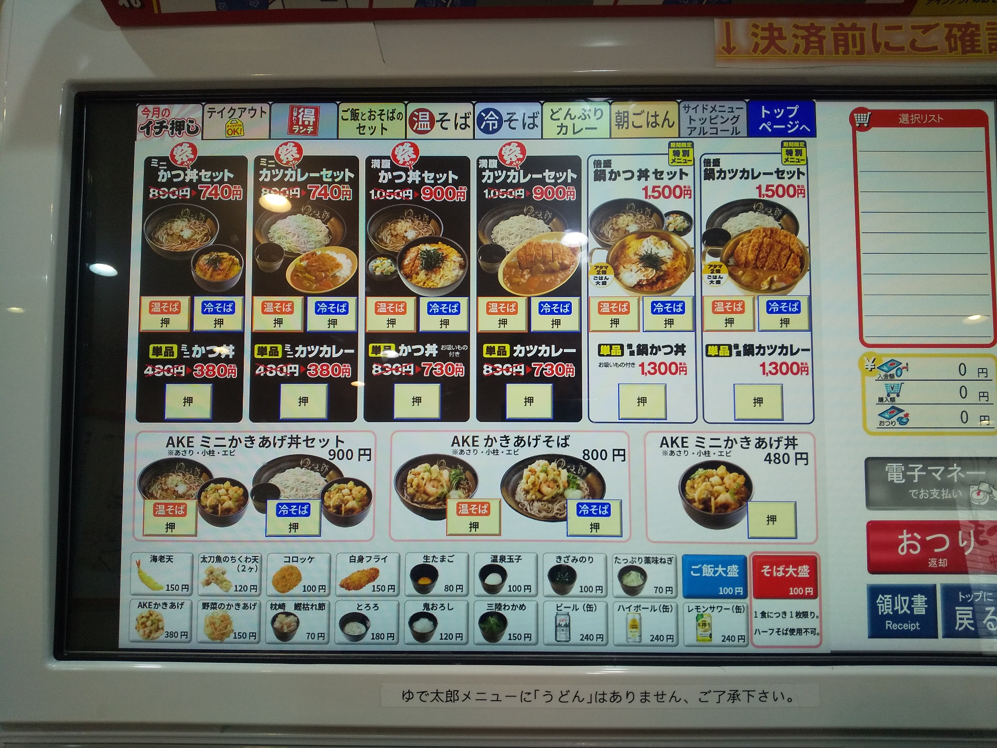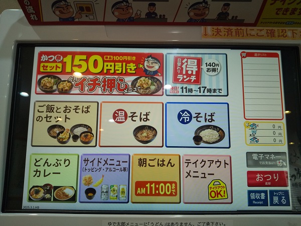 券売機のトップ画面で左上「ゆで太郎メニューへ」をタッチ。