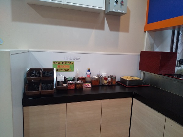 受け取り口の所で箸・スプーン・薬味・無料天かす。