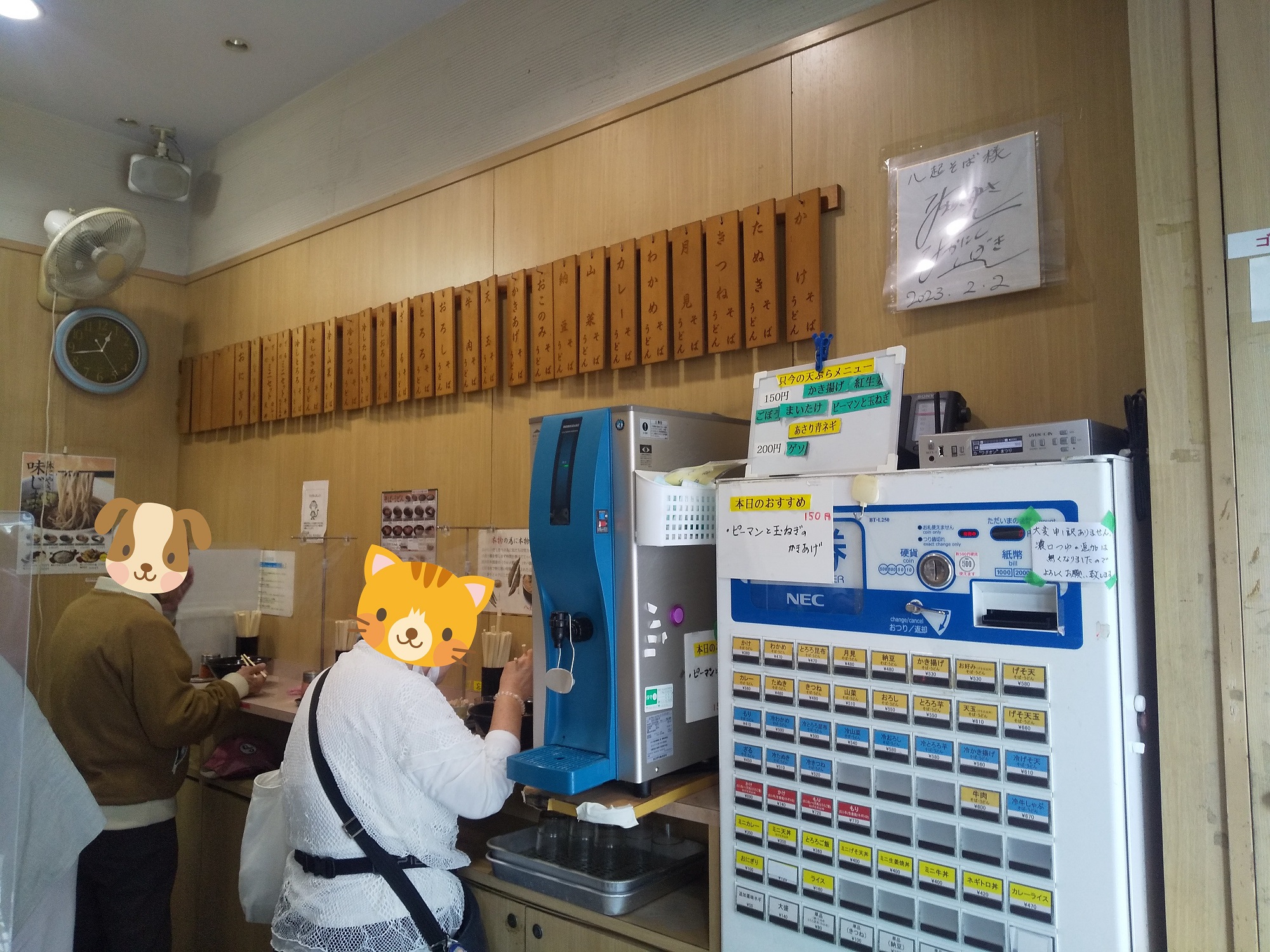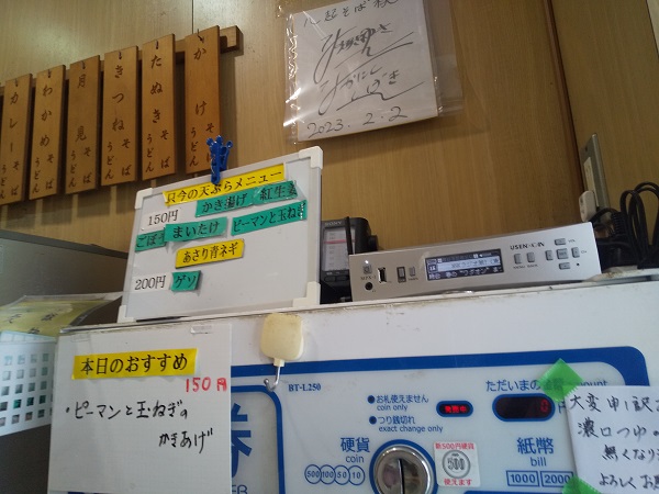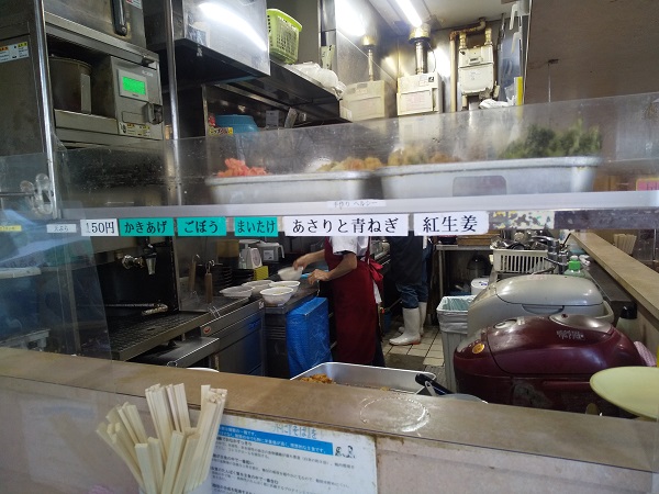 2017年頃までは100円の天ぷらは小さめなのが2枚乗り、2種類も可能(ゲソ天とかき揚げは1枚1種)と個性的でお得だったが、現在は150円天ぷらは大きめの1枚のみ、ゲソ天は200円になっている。