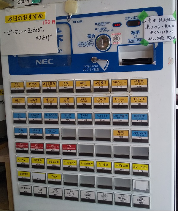 天ぷら類あり、セットものありの標準的立ち食いそば屋。外のメニューを見て、入口のところの券売機で食券を買う。