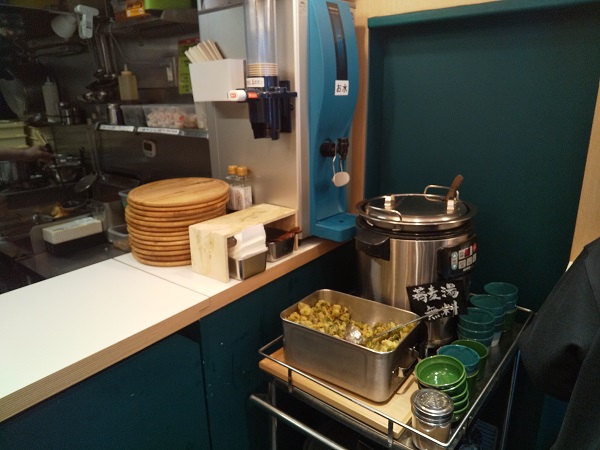 6人しか収容できないので満員なら並んで待つことになるが、訪問時は6人目で潜り込むことができた。水セルフ。無料の特製天かす(やや大きめに切られたネギの天かす)&そば湯あり。