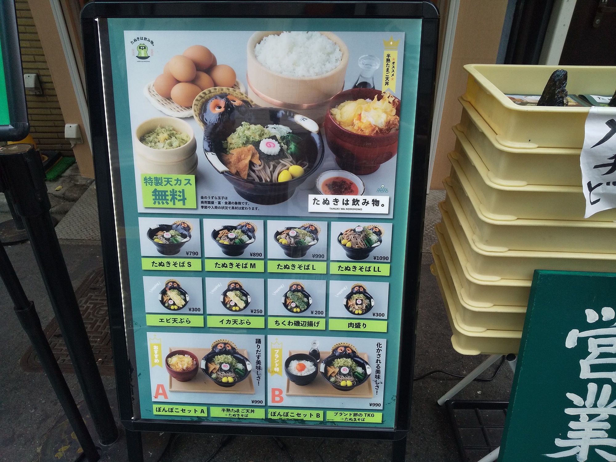 店頭メニュー。サイズ(S/M/L/LL)、トッピングの有無、単品/セットもの の違いでの『たぬきそば』。実際は『冷したぬきそば』。