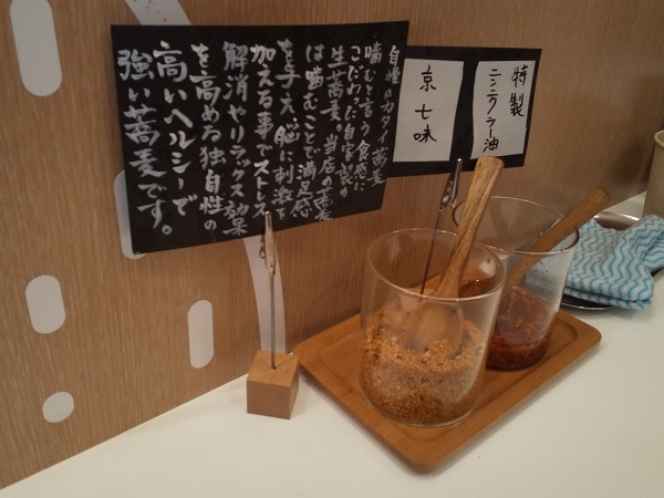 太め、コシの強い麺。【なぜ蕎麦】と同じものかしら? 飲み物なんてウソ わしわし食べて食べ応えあり。なかなか美味しいね。途中で京七味と特製ニンニクラー油を投入して味変を楽しむ。