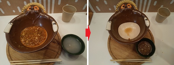 そば湯はどうしよう? 信楽焼のたぬきの器に入れて持ち上げて飲むのは はばかれるので、たぬきの器に残ったつゆをそば湯に入れることにした。飲み干した たぬきの器の底から文字が出るのを期待したが、何も起こらなかった