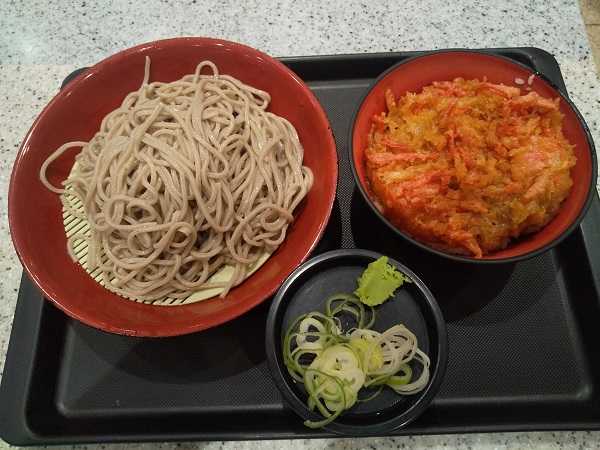 麺は、 そば/うどん 温/冷 が選べる。当店の『もりそば』はとても自分の好みにあっているので冷たいそばを選択。『紅生姜天丼』をいただくのは初めてだが、【富士そば】さんの紅生姜天は美味しいからね。温かいつゆをかけてくれているから、丼にしてもイケるね