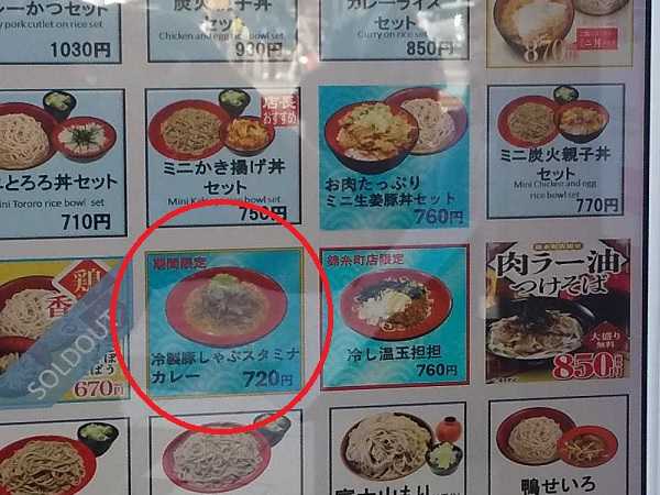そう、目当ての品で” なんとなく珍しく感じる『カレーそば』”に該当するのは、『冷製豚しゃぶスタミナカレーそば』なの