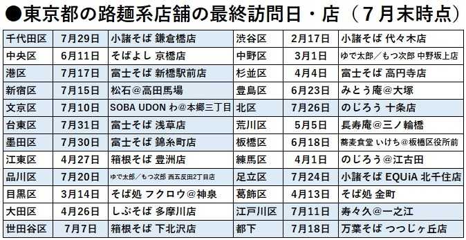 今月は、千代田区・港区・新宿区・文京区・台東区・墨田区・品川区・世田谷区・北区・足立区・江戸川区・都下(調布市)の12地区の路麺店を訪れた。神奈川県の店にも訪れている。