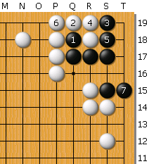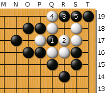 と言うことで、昨日の答えは下の図の通り。 黒1でほうり込めば白がどう打っても死になる。上の図のように白2で取れば以下5までで、この後白がT17に打っても「隅のまがり4目」になる。隅のまがり4目とは何かって?それは自分で調べてください。(^人^) ちなみに、先にオキから打つと上の図のように生きてしまいます。 余談だけどT19の黒石がないと、ほうり込んだ後、白にQ19にさがられて生きるんだよね。しかし、この問題は作るのに結構時間がかかったな。次に詰碁を作るのはいつになることやら・・・。