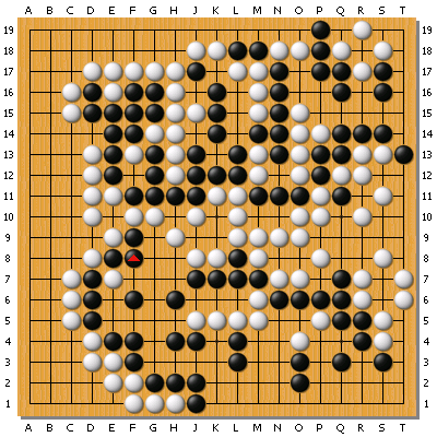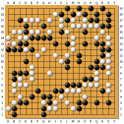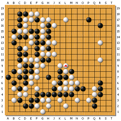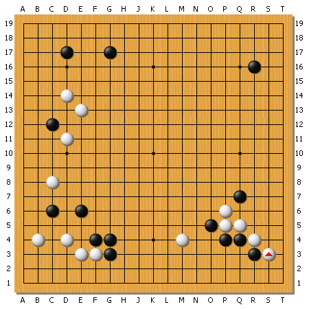 最近タイゼムで打つことが多くなってきている。ここではなかなか昇段しづらく、降段しやすいような制度になっている。詳しくはここを見てくれ。 今の段位で、でだしは勝率5割程度で「この辺のランクで安定しそうだ。」と思っていたが、その後負け碁を拾ったり、きわどい勝負でなんとか逃げ切ったりして、まぐれ全開で残り2戦で1勝すれば昇段という所までいってしまった。 で、本日1局打って何とか怪しげに勝利。昇段できたのはいいのだが、この段位ではなかなか勝たせてくれなさそう。すぐに降段するのが目に見えてる。(ToT) 記念に本日の対局のsgfを貼っておこう。(;RE[白中押し勝]AN[互先 コミ6目半出し];B[pp];W[dp];B[pd];W[dc];B[fq];W[cn];B[dr];W[nq];B[cq];W[qn];B[np];W[mp];B[no];W[qq];B[qp];W[pq];B[oq];W[or];B[op];W[mr];B[mo];W[pj];B[lp];W[qf];B[mq];W[nr];B[lr];W[rp];B[ro];W[rq];B[rn];W[qm];B[qk];W[ql];B[qo];W[pk];B[qh];W[ph];B[rk];W[qi];B[rl];W[ck];B[ci];W[ce];B[cg];W[ek];B[bo];W[co];B[bn];W[bm];B[cp];W[ei];B[eh];W[fh];B[eg];W[fg];B[ee];W[ff];B[de];W[cf];B[ec];W[db];B[eb];W[dd];B[ed];W[gd];B[hc];W[fi];B[bg];W[bf];B[da];W[ca];B[ea];W[bb];B[kd];W[nc];B[nd];W[md];B[ne];W[oc];B[pc];W[me];B[pf];W[qe];B[od];W[qg];B[mc];W[lc];B[mb];W[lb];B[ob];W[ld];B[jc];W[mg];B[kf];W[rc];B[rd];W[qd];B[rb];W[qc];B[qb];W[kq];B[lq];W[gp];B[eo];W[gq];B[do];W[gn];B[dm];W[cm];B[fm];W[fr];B[eq];W[gm];B[fl];W[dl];B[gl];W[hl];B[hk];W[il];B[gj];W[cj];B[fo];W[ip];B[hr];W[gr];B[iq];W[hq];B[jr];W[jq];B[ir];W[jn];B[ko];W[jo];B[nl];W[om];B[nf];W[lg];B[oh];W[mj];B[oi];W[rh];B[mi];W[li];B[mh];W[lh];B[lj];W[kj];B[lk];W[kk];B[jh];W[ll];B[mk];W[ji];B[kh];W[ki];B[ml];W[ma];B[nb];W[gc];B[gb];W[hd];B[id];W[bi];B[af];W[ae];B[ag];W[bd];B[bh];W[di];B[ch];W[ai];B[hf];W[fe];B[kl];W[jl];B[km];W[kn];B[ln];W[ig];B[if];W[ih];B[jf];W[rm];B[sm];W[sb];B[kb];W[fb];B[hb];W[fc];B[fa];W[rj];B[kr];W[jp];B[go];W[ho];B[ij];W[ii];B[ms];W[rs];B[ns];W[os];B[ls];W[pr];B[ol];W[pl];B[nm];W[on];B[ka];W[la];B[ke];W[mf];B[ng];W[pg];B[pe];W[jm];B[lm];W[oj];B[nj];W[kc];B[jb];W[an];B[bp];W[fp];B[ep];W[qj];B[sl];W[es];B[gs];W[na];B[ra];W[oa];B[pa];W[fj];B[gi];W[gh];B[hi];W[hh];B[ik];W[fk];B[gk];W[jk];B[em];W[og];B[he];W[nn];B[mn];W[ao];B[ap];W[am];B[er];W[fs];B[hs];W[sp];B[ds];W[hp];B[ok];W[kp];B[of];W[pn];B[lo];W[sj];B[sa];W[sc])