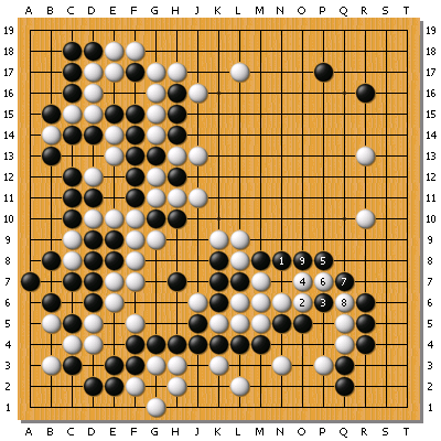 最近ネット対局はKGSよりもタイゼムで打つことが多くなっている。KGSだと対局中に接続が切れることがしばしばあって、それで時間が切れて終わってしまった対局もあった。タイゼムだと快適に対局できるんだけどね。 前にも書いたかもしれないが、タイゼムでのIDは「jyuukobo」。なぜかlivero6が使えなかった。(T0T) タイゼムではKGSに比べて、同じ棋力でも実力の差があるみたい。人が多くて対局相手に困らないのは○ですね。 ↓はタイゼムでの1局。こちらの黒番。 右下で2段バネされたのだが、これって難解なハメ手らしい。実戦ではO3にかけついだのだが、これでは屈服してしまっている。正しくはR5の切りからノビだったみたい。その後の変化は・・・自分で調べてください。(-。-)y-゚゚゚