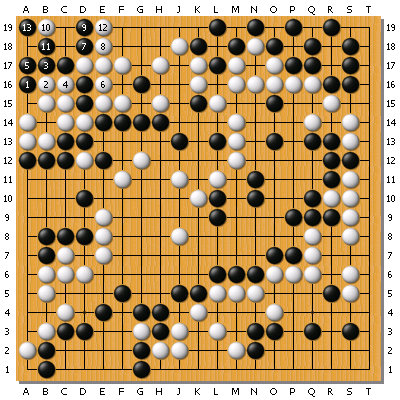 最近更新がサボリがちになってしまっている。いかん、いかん、何か書かなくては。 ↓は先日の対局。互先でこちらの黒番。 黒A12に対して(ここが良い手かは分からないけど・・・)白が手拍子で▲に受けたので、この後黒から左上に手が生じた。そんなに難しい手筋ではないけど、実戦で打てたのは快感だったよ。 正解は明日にでも~。