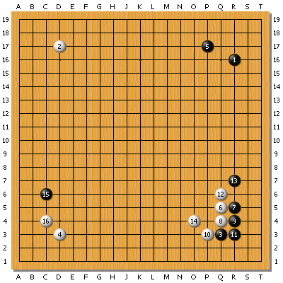 本日のタイゼムでの一局のこと。相手から申し込まれて対局することになった。持ち時間5分、秒読み30秒3回とかなりの早碁で打つことになったが、早碁は苦手なんだよな。 こちらの白番。下図の16手目まではサクサク進んだのだが・・・。 17手目を長考。と言うか全然打ってこない。どうしたんだろうか。タイゼムでは接続が切れた場合は持ち時間は減らないので、お互い接続切れはないし、もし用事が入ったのなら引き分けを申し込むこともできる。 そのまま打ってくることもなく、時間切れ勝ちになってしまった。対局相手に何があったのだろう・・・。