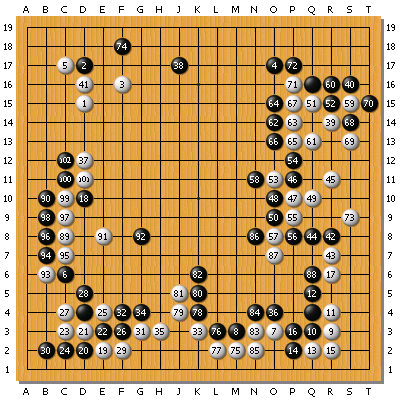 本日の午後は時間があったので、またもや碁会所に行ってきた。今回は運良くK市で5本の指に入ると言われていた人と打つことができた。3子の手合いだったのだが、さすがに置き過ぎだと思っていた。お互いに。 3子と言うことで、手堅く主導権を取っていく方針で。右辺の白石を適当に攻めつつ厚みができて黒の流れになり、白89の打ち込みに対しても黒は連絡しつつ白地を削って完全に優勢になった。 が、黒102以降白に打ちまわされかなり焦ったが、大ヨセで白が損をして黒の中押し勝ちとなった。あー、これでしばらくは碁会所には行けなさそうだなー。