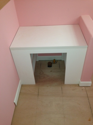 トイレの中にも手洗いコーナーを作ります。 もちろん既製品ではなくてデザインして作ります。 そして完成したのがこれです。 この上にハート型の洗面ボールが取り付けられます。 作った台座の部分は 正面からは見えないように、トイレットペーパーや洗剤とかが おけるように棚を設置してあります。