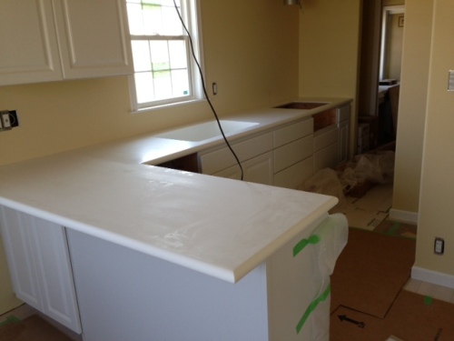 輸入キャビネットの設置が終わったので、採寸して製作してもらった人工大理石のカウンターが今日納品でした。 いつもですが何度も計ってチェックしてますが、実際に設置するまでは緊張します。 その心配も問題なく設置完了。 かなりの重さで3人でやっと運びました。L型でジョイント部分があるので、後日完全にくっつけます。シンクも一体型です。 つなぎ目も無いのでお掃除が楽そうです。 そしてお客様から支給されたIHもセット完了。 出巾と左右をあわせて固定しました。 傷が付かないように養生をしてとりあえず完了となりました。