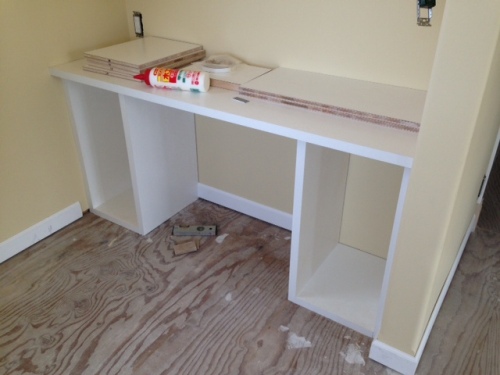 昨日は造り付け家具を作ってもらいました。 最初に作ったのは奥様のコーナーです。 このほかに扉をつけたり、棚を付けたり、あと特注で作ってもらう大きな鏡を取り付けます。 次はパウダールームです。 アメリカのキャビネットとの組み合わせで設計したので、これが一番手間のかかる仕事になります。 最初に採寸して必要になる部材をカットしてもらいます。キャビネットを設計書の寸法通りに並べます。 カウンターとその受けになる部分は、通常はボンドとビスで固定するのですが、後々ずれたりしないように家具と同じ加工をしてもらいました。 この溝を両方に掘り、ボンドを入れてビスケットの形の木をはめてがっちり固定します。 それからベースフィーラーを加工したり、カウンターを固定したりして、できあがりました。 あとは設備屋さんが洗面ボールと水栓の取り付けを行います。 そしてこれだけじゃもの足りません。 間接照明があれば雰囲気がいいのでその台座も作成です。 写真の壁に少し見えているのがそれです。 ここにモザイクタイルを貼ってアクセントをつけます。 照明の台座は仮固定なので、後日水栓を設置してみて、使いやすい高さに微調整する予定です。