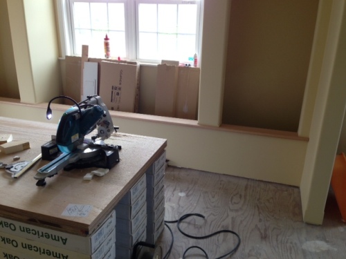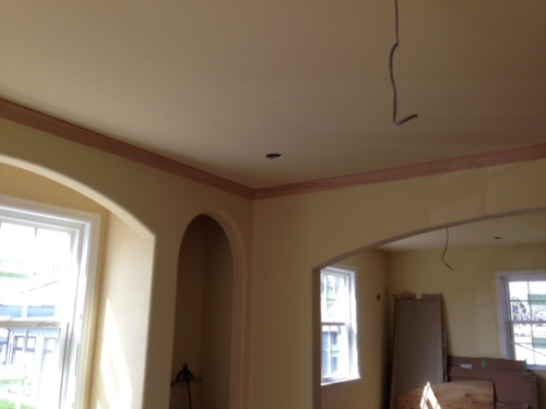 天井と壁の境目につけるモールディングを日本語だと廻り縁、アメリカだとクラウンと言います。 そのクラウンの施工を本日行っています。 リビング ダイニング キッチンというメインの部屋なので、大きめの H49というタイプのもので斜めに取り付けるため、大工さんが角度を出すのに慎重にカットして、進めていました。 もちろん塗装して仕上がりになります。 現在はダイニングの施工です。 明日は造作家具工事の打ち合わせに行って来ます。