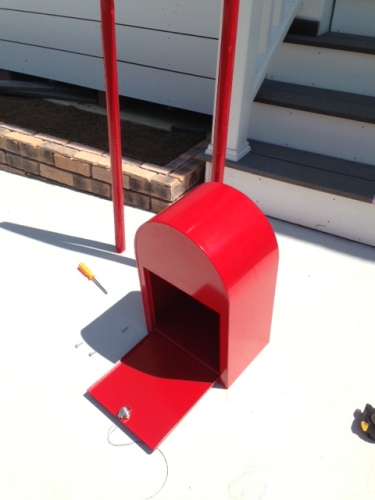 外構工事も終わりお客様が購入されたポストを設置依頼されたので行って来ました。 あらかじめ位置は打ち合わせしておいたのでフレームはコンクリートに埋め込まれています。 いざ設置しようと思ったら、本体に固定用のビス穴があいていません。 しかたないので計測してインパクトドライバーで、少しずつ穴をあけていきました。 傷でも付けたら大変なので、少しずつ様子を見ながらの作業となりました。 また本体がしっかりとした作りのため、なかなか穴があきませんが猛暑の中、格闘すること30分、綺麗に4つの穴をあけることが出来ました。 そして設置しました。 真っ赤なおしゃれなポストです。 鍵の交換も頼まれたので、それも終わらせてきました。にほんブログ村