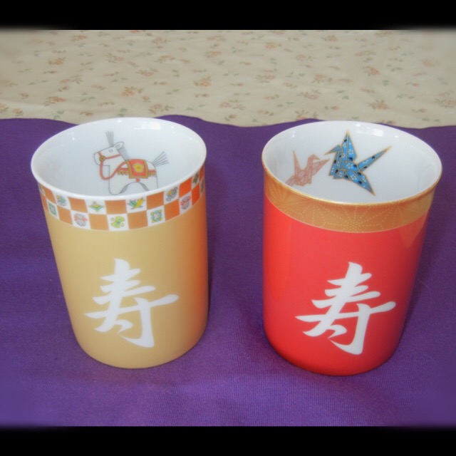 こちらは主人への還暦祝い(赤)と義父への米寿祝い(金)のお湯のみ