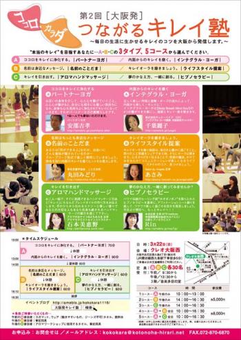 3/22(日)「ココロ・カラダ つながる きれい塾」 というイベントに参加させていただきます。 午前中はヨガのワークを2本でからだを整えきれいに、午後は心を整えてきれいになるというワークショップ。 午前中は、チバレイさんこと千葉麗子さんのワークもあります!(生チバレイさんに教えていただけるんですよ!!!!!) 午後は2コースあって、ことだま師・丸田みどりさんとご一緒にBコースでのワークを担当させていただきます。 名前は生まれて来てはじめてもらう、プレゼントである。あなたの名前の使命は・・・ ということだまのワークショップにたいし 私のライフスタイル提案のワークショップは大切な人や、周りの方に、さりげないハッピーをプレゼントしましょう。分かち合い人に喜んでいただくことで、自分もさらにハッピーになってきれいオーラが磨かれます♪というまるでギブアンドテイク、対になっているような2つのワークです。 今のアンジェラのサロンと同じで私のが一番説明しにくくてわかってもらいにくいワークショプなんですけど(1回体験していただけたらわかってもらえると思うんだけど)、何がしたいかと簡単にいうと 「こころ」という見えない部分の充足感の方法と楽しみ方をお伝えできたら・・・ 詳細はこちらへ!!! (ちなみにヨガの講師陣は、午後のワークにも受講されるそうでわたしたちも午前のヨガに参加します)