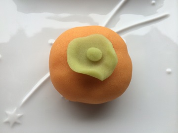 今日の和菓子は「みのり」。練りきり製の柿です。練りきり生地でこし餡を包み成形します。ヘタの緑は抹茶で色付けしてあります。「やっぱり柿の味がするね」とおっしゃるお客様がありますが柿は入っていません