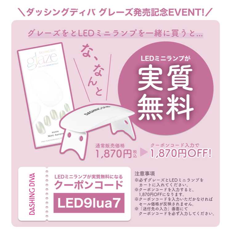 今ならDASHINGDIVAの公式サイトから新商品のglazeとLEDミニランプを一緒にご購入頂きますとLEDミニランプが実質無料!送付先の入力画面にて必ずクーポンコード【 LED9lua7 】と入力して下さい🍀入力頂かないとLEDミニランプは付属されません。またキャンペーンが終了となりますとLEDランプの無料プレゼントも無くなりますので気になる方はお早めに楽天ショップからもスターターキットなど発売中♪こちらもランプが付きます🥰【公式】glaze ジェルネイル シール【選べるアートジェルネイルスターターキット】ジェルネイルシール ジェル ネイル ジェルネイル ネイルチップ ネイルシール 貼るだけ つけ爪 ネイルケア ベースコート リムーバー 春ネイル 母の日 ペディキュア 付け爪【tg_smc】価格:1650円(税込、送料無料) (2021/4/28時点)【公式】glaze ジェルネイル シール【選べるワンカラージェルネイル スターターキット】ワンカラー ジェルネイルシール ジェル ネイル ジェルネイル ネイルチップ ネイルシール 貼るだけ つけ爪 ネイルケア ベースコート リムーバー 春ネイル 母の日 付け爪【tg_smc】価格:1320円(税込、送料無料) (2021/4/28時点)【公式】glaze ジェルネイル シール【選べるジェルネイル2点 スターターキット】ジェルネイルシール ジェル ネイル ジェルネイル ネイルチップ ネイルシール 貼るだけ つけ爪 ネイルケア ベースコート リムーバー 春ネイル 母の日 付け爪【tg_smc】価格:3000円(税込、送料無料) (2021/4/28時点)【公式】glaze ジェルネイル シール【選べるジェルネイル3点プレミアムランプ スターターキット】ジェルネイルシール ジェル ネイル ジェルネイル ネイルチップ ネイルシール 貼るだけ つけ爪 ネイルケア ジェルランプ 春ネイル 母の日 ペディキュア 付け爪【tg_smc】価格:5980円(税込、送料無料) (2021/4/28時点)【公式】glaze ジェルネイル シール【選べるジェルネイル3点グレーズホームサロンセット】ジェルネイルシール ジェル ネイル ジェルネイル ネイルチップ ネイルシール 貼るだけ つけ爪 ネイルケア ベースコート リムーバー 春ネイル 母の日 ペディキュア 付け爪【tg_smc】価格:9980円(税込、送料無料) (2021/4/28時点)
