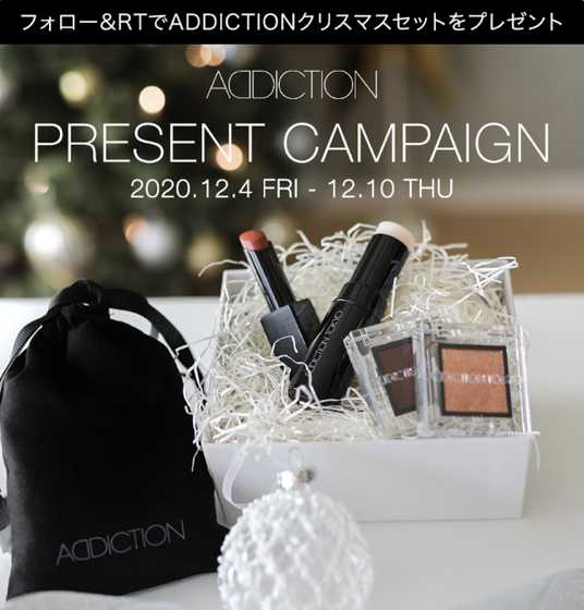 ADDICTION クリスマスTwitterキャンペーン実施中♪応募規約は下記をご覧下さい■応募方法①公式アカウント(@StyleADDICTION)をフォロー②キャンペーン投稿をリツイート■期間2020年12月4日(金)~12月10日(木)■賞品5名様に人気アイテムが入った『ADDICTIONクリスマスセット』をプレゼント!・ザ アイシャドウ 002T Dark Rose・ザ アイシャドウ 015SP Gleamy Pond・ザ グロウ スティック 011G Feel the Heat, See the Light・ザ リップスティック エクストレム シャイン 003 Your Breath・ADDICTION巾着S■当選発表ご当選された方にはADDICTION公式TwitterアカウントよりDMを差し上げます。発表は12月中旬を予定しています。※当選者の発表はDMの送信をもってかえさせていただきます。※アカウントを非公開設定にしている方は当選対象外となります。※賞品の発送は日本国内に限らせていただきます。Twitterのアカウントがある方は是非ご応募下さい🍀
