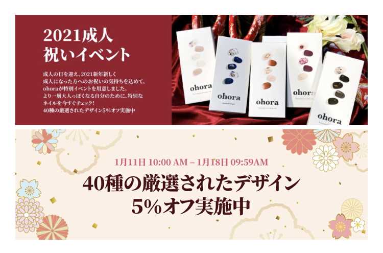 ohoraが成人の日を祝したイベントとして40種類のネイルーシールを5%OFFにて販売中♪人気のアイテムは既に売り切れてるけどこの機会に欲しかったあのネイルシールをお得にGETして下さい♡