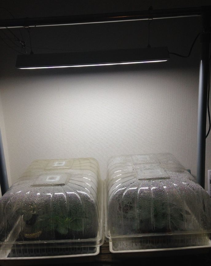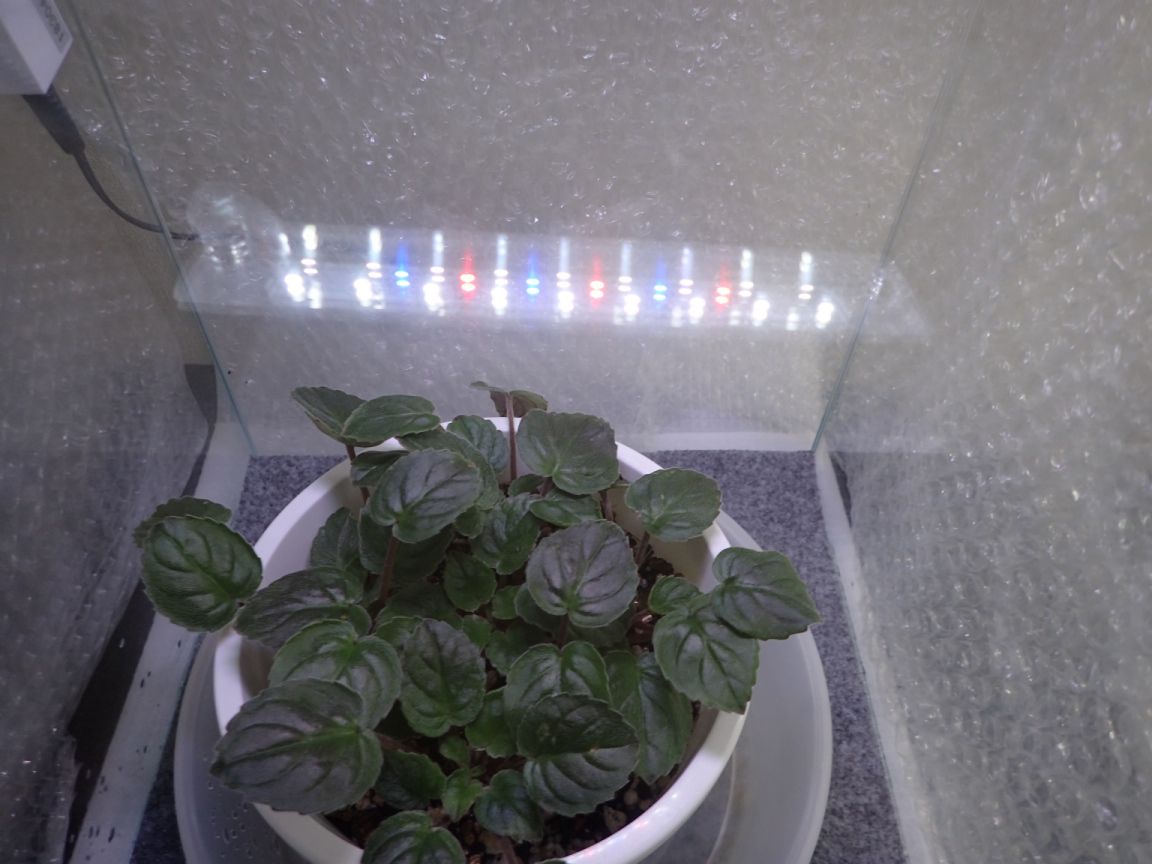 120cmのLEDライトがうちの棚(W120cm H180cm 4段)では明るすぎるので、別のメーカーの60cmのLEDを買いました。新しく買ったLEDは1チップに4色(赤緑青白)の素子が入っているもので全光束は1081.5lmです。透明のカバーには光線透過率60%の拡散フィルムを貼りました。棚の1段の高さ約40cmで、ライトは葉面から25cm前後の上段の網下に設置。60cm用のライトだと120cm幅棚では左右が照射面から外れて暗いのですが、昼間はルピコラやペンジュラならそこでも明るいくらいです。棚の置き場は2階南面窓際で、外にはベランダがあり庇があるのと、5階建ての建物が南側にあるので、今の時期ですと朝30分、午後30分程しか日光が入らない所です。