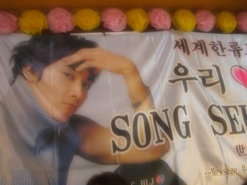 こちらから先に見てくださいね(夏の香り 『ミヌssiの衣装』 出版パーティー 準備編 は、5月11日付けになっているので、3つ下のスレにありますが、こちらをクリックしてください) 本番当日です心配した天気も、良いお天気に一週間ほど寝不足が続き、 前日は、テンションが高く眠れませんでした~ 開会の1時間前に会場に入り、マイクの準備や、テーブルに座席番号を貼ったり、入り口にボードを掛けたり、会費徴収の準備をしたり、音響のセッティングをしたり、カラーの花をコーディネートしたり、細かい準備に右往左往~~~でも、会計はしっかり者でいらっしゃるPさん、会場セッティングは、Mちゃん、Jさんコンビの連携で、時間までには準備バッチリOK 会場の入り口にかけたボードは、こんな感じにちょっと気づかなかったかな~2時間のパーティーの始まりです(くじで席に着かれた皆さんを前にご挨拶をさせていただきましたが、ほとんどの方が初めてお会いする方ばかりの中でかなり緊張いたしました)(マイク持ったら、やっぱり歌うっきゃない私ですが。。。今回はシオラシク)Kenshinさんが創作をされる時には、いつも聴いているという春のワルツの『守護天使』の曲をバックに、Kenshinさんからの、今回の本が出版されるまでのエピソード、想いなどを、熱く熱く、長く長~く(爆)、語っていただきました。店内はこんな感じ次に、Mちゃんの音頭で、コンベ~そして、参加できなかったOさんからのメッセージを引き続きMちゃんが朗読されました。(とても素敵なお声にうっとり)お食事をしながら、しばし、ご歓談会の間中、2つのスクリーンからは、夏の香りのMVが流れ、素敵なミヌssiが微笑んでいます 席を移動して、ご挨拶されたり、名刺の交換をされたり、と、程よくお酒も入り、皆さんとても和やかでしたねKenshinさんが描かれたイラスト、本では白黒でしたが、本当は、とても素敵な色で描かれていて、コピーしてきてくださったファイルを見せてくださったり、ちょっとした抽選会をしたり、楽しく時間が過ぎていき。。。会も終わりに近づき、Kenshinさんから閉会のご挨拶をいただき、最後に、Kenshinさんにお渡ししたカラーの花・・・ もっともっとお話したかったけど、全員で記念写真を撮り、名残惜しく閉会に~でもそのあと、恒例(爆)の新大久保で、2次会へ~13人ほどだったでしょうか(以外に多かった)なんと、新大久保まで歩く歩くアジュマの群れ~~いつも大人数でもOKな行きつけに店にGO~日曜日でも空いている(爆2)、穴場のそこは、ラッキーなことに、飲み物が100円DAY~(こんな嬉しいことはない)たくさん歩いたので、ビールがおいしかった~幹事の大役も無事に終わって、お疲れさま~ここでも、数杯飲んじまった~でも、みなさん、けっこういける方ばかりでうれしそしてみんな楽しくて魅力的な方ばかり~初めてお会いしたばかりでも、こんなに打ち解けることができるって信じられないでしょ~でも、スンホニを好き、ってだけで繋がっているんですよ~不思議なご縁です Kenshinさんのこの本は、ユン監督とスンホニにも送られ、監督の事務所からご返事を頂いたそうですKenshinさん、これからも、創造を膨らませ、どんどんすばらしい作品を増やしていってくださいね(私も、Kenshinさんを見習って、自分の夢を実現できるよう、努力します) Kenshinさん・・・『夏の香り ミヌssiの衣装』 の出版、本当におめでとうございます そして、会の準備に、お手伝いくださったMちゃん、Pさん、Jさん、 バタバタしていた私を助けてくださって、本当にありがとうございましたまた、楽しい企画やりましょうね~Oさん、実況中継もあったけど、また、感動に浸ってくださいね~ 余談ですが・・・ファジャンシルに入ったら、スンホニの歌う I Love You~がちょうど流れていて、甘いお声の中、用を足すのがちと、恥ずかしかったです