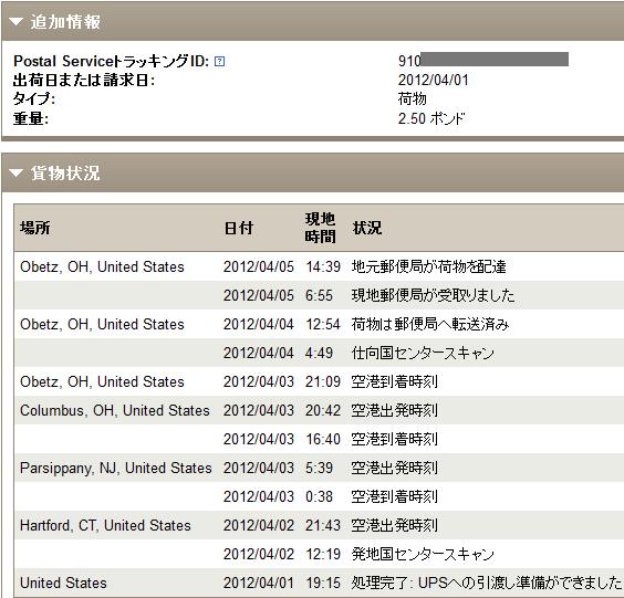 アリゾナのセラーから購入したのが届いた。4/4発送なので、まあ普通。First Class Mailで送料$25.73だから、52oz。$1.5位しか値上げしてないんじゃない?USPSが激しく値上げと聞いていたけど、EMSやPMIがメインだったってことか。Processed through USPS Sort Facility April 06, 2012, 7:37 pm LOS ANGELES, CA 90009Depart USPS Sort Facility April 04, 2012 TUCSON, AZ 85726 Processed at USPS Origin Sort Facility April 04, 2012, 9:08 pm TUCSON, AZ 85726 Dispatched to Sort Facility April 04, 2012, 5:18 pm CORTARO, AZ 85652 Acceptance April 04, 2012, 9:38 am CORTARO, AZ 85652