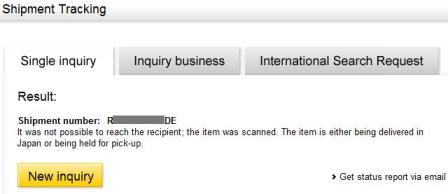 4/16にドイツ、アメリカ、フランスで頼んだものがあった。ドイツが遅くなるのかと思いきや、一番乗り。書留だから普通のエアメールより早かったのかしら?(いつもglobal mailでdeutsche post経由になると遅いのに…)日本時間のお昼頃頼んで、夜にはステータスがProcessingというメールが来た。なんだろうこの中途半端なメールは…と思いつつそのまま待ってたら届いた。日付を見ると注文日の発送だから、あのメールは発送メールだったのかしら?melunaはそっけなくて追跡番号も知らせてくれなかったけど届いたのを追跡してみると結構順調4月18日 2:41 国際交換支店から発送 FRANKFURT GERMANY4月20日 20:47 国際交換支店に到着 成田国際空港支店4月21日 9:00 通関手続中 成田国際空港支店4月21日 11:48 国際交換支店から発送 成田国際空港支店4月22日 3:50 到着4月22日 ご不在のため持ち戻り deutsche postで追跡してみると結構そっけない追跡画面だった→今みたらようやく「The item was delivered on Apr 25, 2012.」になってる。更新タイミングは1日に1回程度なのかしら??