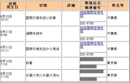 注文から12時間程度で出荷通知が来ていつもapothica.comは早いな、と思ったら実際の出荷はもうちょっと時間かかってた。これまでは送り状のオンライン作成してなかったから実は間が空いてたってことに気づいてなかったけど。今回は現地時間ベースで7(木)の10時前に頼んだ。で、追跡はこんな感じDelivered June 16, 2012, 3:07 pm JAPANArrival at Post Office June 16, 2012, 12:41 pm JAPANCustoms clearance processing complete June 16, 2012, 9:53 am JAPANCustoms Clearance June 16, 2012, 9:15 am JAPANProcessed Through Sort Facility June 15, 2012, 2:19 pm JAPANProcessed Through Sort Facility June 13, 2012, 9:43 am ISC SAN FRANCISCO (USPS)Arrived at Sort Facility June 13, 2012, 9:40 am ISC SAN FRANCISCO (USPS)Depart USPS Sort Facility June 11, 2012 SALT LAKE CITY, UT 84199Processed at USPS Origin Sort Facility June 11, 2012, 3:35 pm SALT LAKE CITY, UT 84199Accepted at USPS Origin Sort Facility June 11, 2012, 2:20 pm WEST JORDAN, UT 84081Electronic Shipping Info Received June 10, 2012Priority Mailだけど、今回は久しぶりに税関出たその日に配達された。最近はいつも翌日だったんだけど…この差はなんで生まれるんだろう??