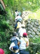 てなわけで、午前中は紅実のクラスの水路探検に付き添ってきましたー今日はお天気もよく、気温もあがる予報でどうなることかと思ったけど・・・紅実たちの学年の、社会科授業の一環なので社会の時間と音楽の時間2時間分を使って学校の裏山?を上ってきました。紅実たちが通う小学校のすぐ近くには、古くからのお寺がありそこには水路が流れ込んでいます。今日、先生の話では、80年、90年も経つ古いものなのだとか。現在では塩ビ管などに変わっていますが、以前は松の木をくりぬいて、松脂などで補強して水管としていたこともあるそうです。防災はもちろん、農業用水、飲料水などにも利用されてきた、その水路の、上流目指して片道30分ほど。もっと上流にはいけるらしいのですが、授業中、30人もの生徒を連れて行ける距離はその程度でしょうね。父兄は自由参加でしたが、紅実のクラスは私も含めて9人参加。途中、道幅が狭くて足場の悪い場所もあるため、はしゃぎ気味の子供たちをちゃんとサポートしないとけが人が出てからでは遅いですからね~ 最初は、民家の軒先みたいな細い道を行き、そのうち山道へ。山の下は、国道、JR。こんなところを歩くことが出来たんだ、というオドロキが多かったです。地元に住んでいたり、上の兄弟のときに経験したりでこの道を知っているママは1人か2人。みんな他の人も、こんなところに道が、こんなところに水路が、きれいな川が・・・・とオドロキが多かったな~泥水のように見えますが、実はめちゃめちゃキレイな、透き通った川が流れていて、下は土色のやや大粒の砂です。まだまだ上流から水は溢れていました。もう少し上流に行けば、滝もあるそうです。 河原が少し開けたところで、休憩になり、子供たちも水に入っていいことになりました。紅実はどーもこういう時は消極的なんせ、時期的に毛虫が多く、ハチやクモも当たり前だけどたくさんでしょ、それが大の苦手の紅実。沢蟹がいる川になんて、入れるわけもなく・・・・しかし、4年生なのに紅実の学年は本当に素直で子供らしい子が多く、男の子は沢蟹捕まえては、せんせい~~っ!途中の鉄橋の上を歩いてる時にJRが通れば、わーーーっ!!!・・・・・何年生なんだっ他のママたちも、かわいい学年だよねぇ~なんて、言っていました。ココまで子供らしいのは、いいのか悪いのか・・・でも、小学生のうちだけだろうし、今はとことん子供らしく学校の周りの自然と一緒に元気に育ってくれれば・・・・なんて感じかな。先週行った友達は、毛虫が多かった、暑かった、と言っていましたが、ずっと林の中を歩いていたので、さほど暑くはなく、毛虫も一度ムネに付いていたけど、即はらったし、大したことなかったかな~もともとトレッキングコースになっているところだったので地元のハイカーさんたちにも会ったりで、気持ちのいいこの季節、気分よく歩けましたー