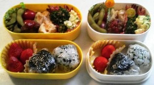 先週の木曜日、紅実は社会見学、百々椛は小学校に入ってはじめての遠足でした。なので、2人ともお弁当。紅実は朝練がさすがに休みだったので、ちょっと助かりました。とはいえ、いっぺんに2人分作らなきゃなのでのんびりもしてられず・・・。左が紅実、右が百々椛用。中身は全く同じ。おにぎりは、ふりかけを混ぜたもの2種と、デザートにイチゴ。おかずは、ポテトサラダに枝豆、ミニトマト、ブロッコリー、しゅうまいとハンバーグ。とにかく、野菜が少ないとイヤだ、という2人、唐揚げとかミートボールとか、子供が好きそうな肉料理はそんなに執着がなくて、このハンバーグも小さいお弁当用の冷凍のものなんだけど、これで十分なんだってさしゅうまいは、北海道物産品で買っておいたカニシューマイ。これも1個、紅実は2個、これでいーんだってさ・・・そのかわり、ポテトサラダはじゃがいもにセロリ、きゅうり、ハム、卵、マカロニ、すり胡麻、などなどをしっかり和えて明太マヨネーズをちょっとだけ加えたもの。これを、結構な量いれてあげてます。でも、さすがに紅実は、幼稚園から同じ弁当箱なんで量が足りなかったようです・・・・・